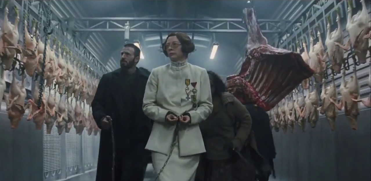 Por otro lado tenemos la parte de la empresa, que es donde Tilda destaca por sobre el resto de personajes, pues interpreta a dos hermanas, una (Lucy) que quiere mostrar un lado bueno, amable y naturalmente responsable de la compañía aunque eso implica costos y riegos, y la otra (Nancy) que es una empresaria salvaje y sanguinaria totalmente racional a quien sólo los negocios importan. Sin olvidar toda la campaña publicitaria para colocar el producto en el gusto de la gente y mantener oculto lo que hay detrás. Usar como rostro de la compañía a doctor Johnny Wilcox, un veterinario amante de los animales, para generar esa confianza en el consumidor, pero que detrás de cámaras no es más que un show, me pareció una excelente crítica y muy atinada. Incluso todo lo que la compañía hace para tratar bien a Mija y usar el incidente con Ojka como más publicidad de los buenos que son.